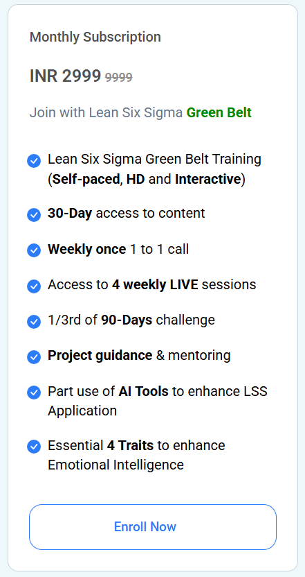 Dear Reader, Thank you for being a part of my email list and I am personally feel that every member on my list is seeking for some help. This can be a way for their consistent career growth, get deserved salaries, promotions or remove a fear of getting replaced. I was thinking about - what can be the best we should do without loosing the impact of results? And I came out of this solution. Now, you can start your learning of Lean Six Sigma Green Belt as a minimal pricing of Rs.2999/- per...
